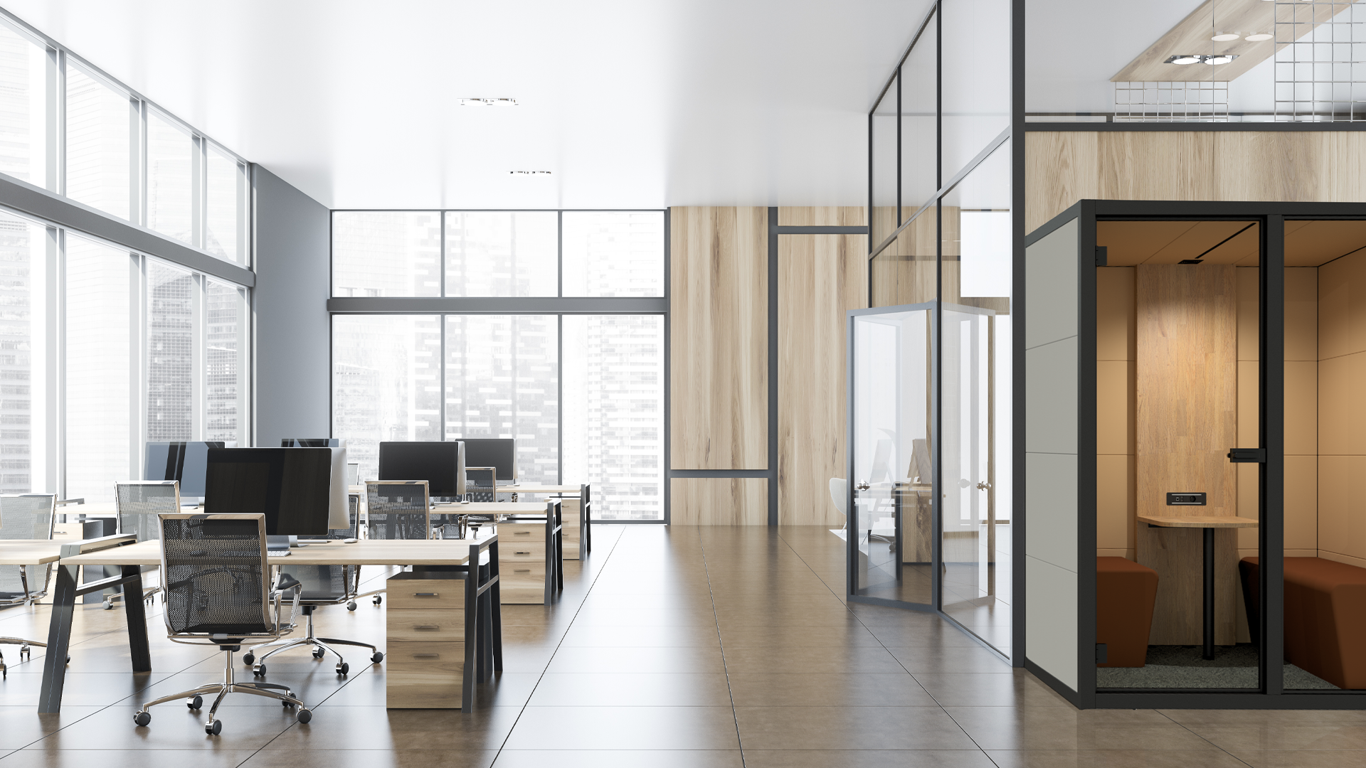 - Zur Grundausstattung gehören ein Tisch und ein Anschlusspaneel mit Steckdose, USB-Ladeanschluss und LAN-Anschluss. Optional ist ein gepolsterter Sitz erhältlich.